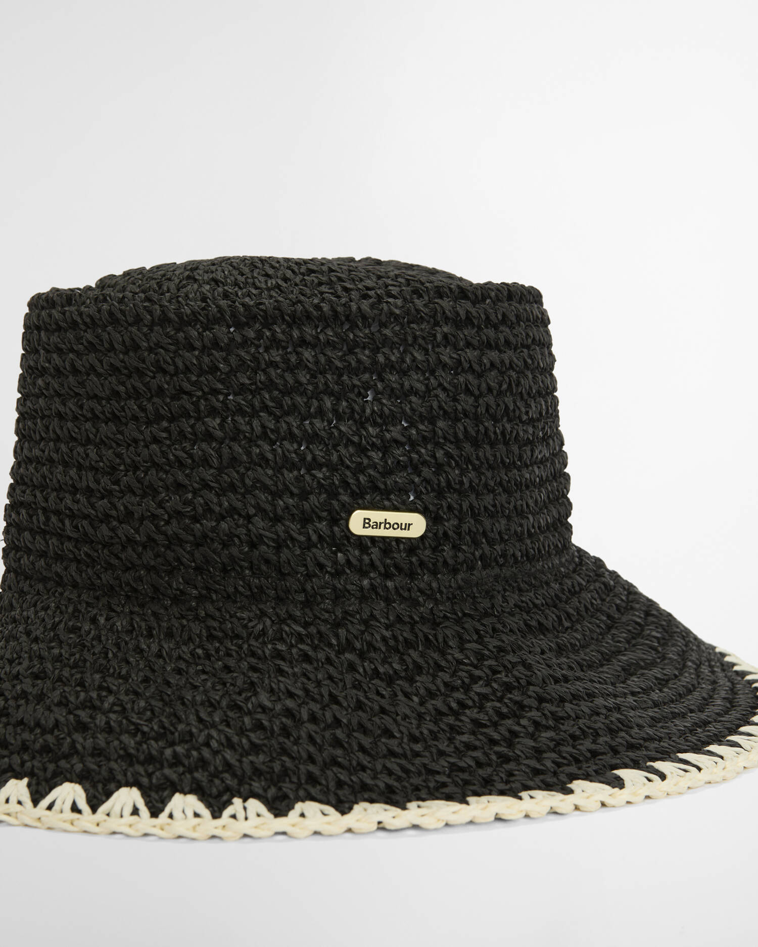 • The Barbour Camille Crochet Hat is a summer-ready bucket hat crafted with a textured crochet-effect weave and contrast whip stitching on the brim. Finished with internal Barbour logo tape and a branded metal plate on the wearer’s left side, it combines heritage detailing with lightweight, stylish sun protection for warm-weather wear.