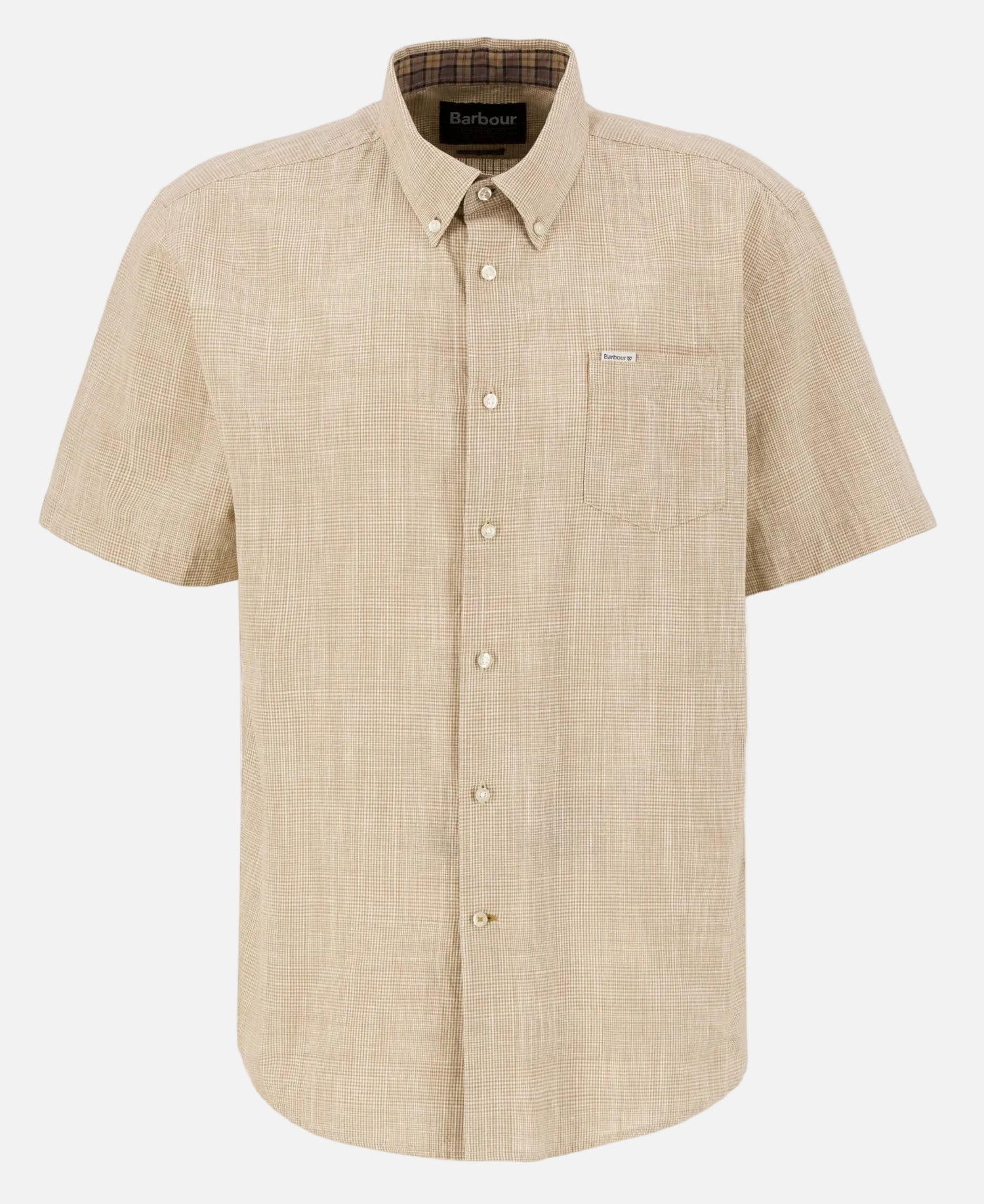 •The Barbour Fleming Linen Blend Short-Sleeved Shirt is crafted from a breathable cotton-linen blend for lightweight comfort. Designed in a micro houndstooth check, it features a button-down collar, spade chest pocket, and back pleats for ease of movement. A subtle tartan trim to the inner collar adds a signature Barbour touch.