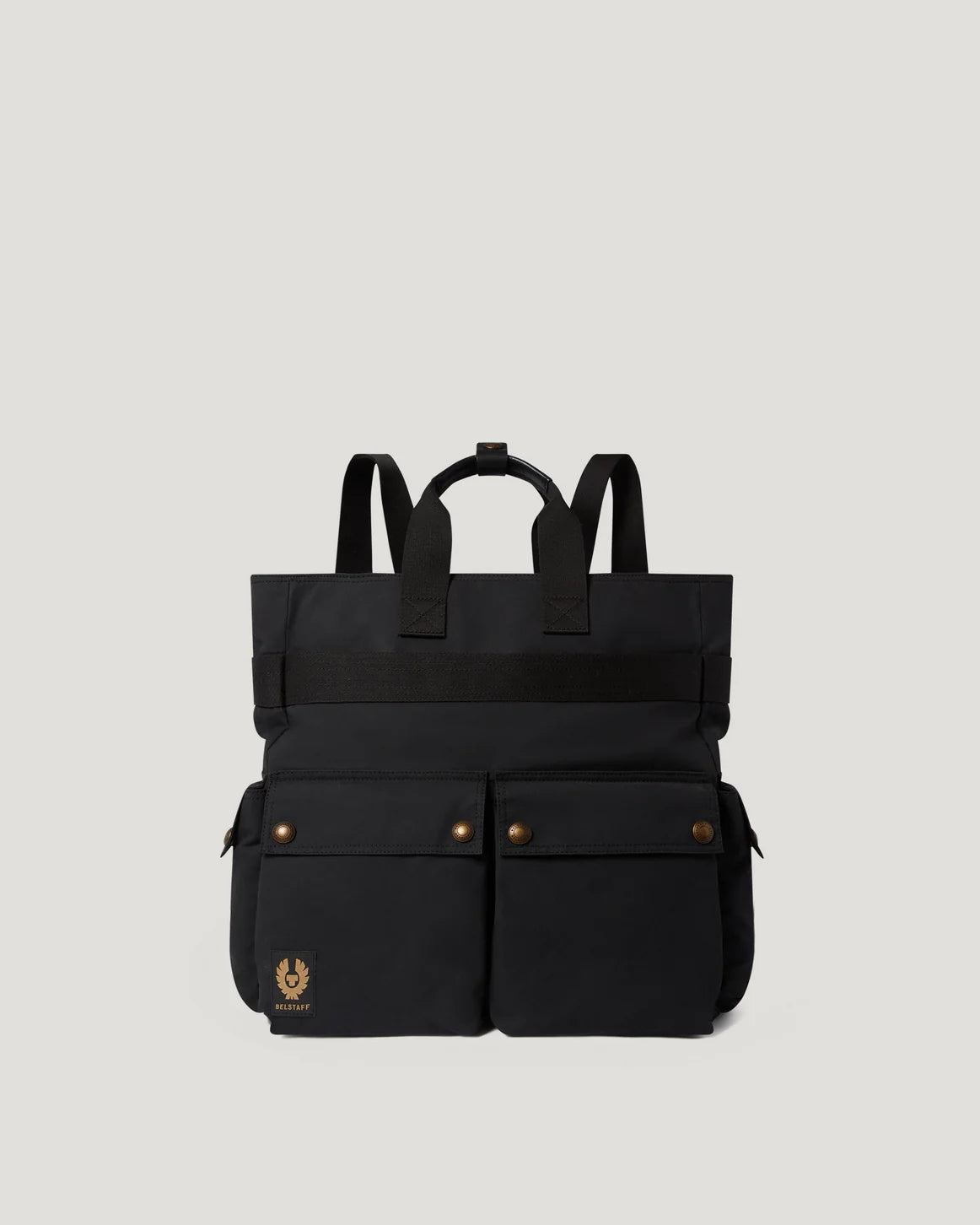 • The Black Trialmaster 2-Way tote can also be worn as a backpack. This functional piece is crafted from Scottish waxed cotton for water resistance, durability, and a unique, rustic appearance that improves with age. The internal pockets help organise and securely store you items when you're on the go. The lining features seasonal Belstaff cotton twill. Pockets with signature antique brass metal hardware inspired by iconic Trialmaster jacket. Seasonal Belstaff Scottish waxed cotton twill linings used in the Trialmaster Jacket. Grab handle and foldaway, adjustable backpack straps. Handy key attachment in front pocket. Internal pockets and compartments