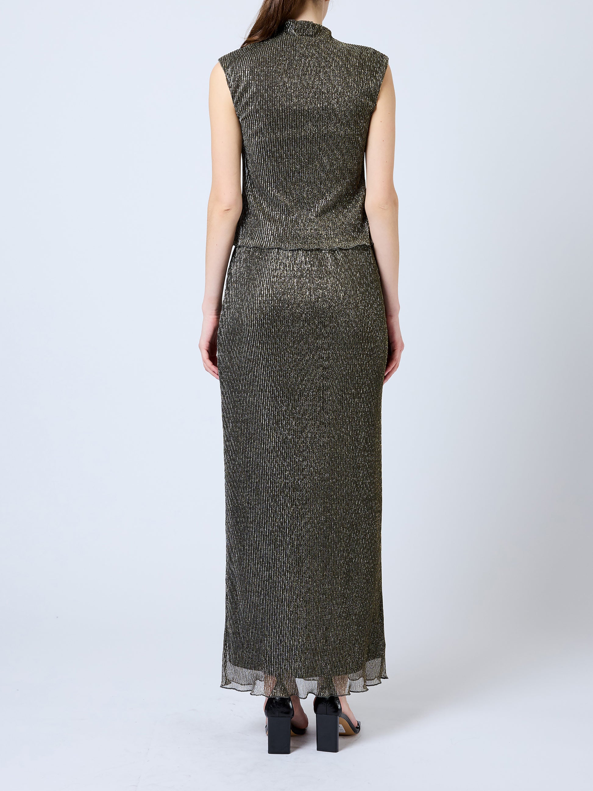 • All that shimmers is our Tamy Lurex Plisse Sleeveless Top. This sleeveless top features a high neckline and lettuce hem whilst presenting metallic lurex stripes in a plisse texture.