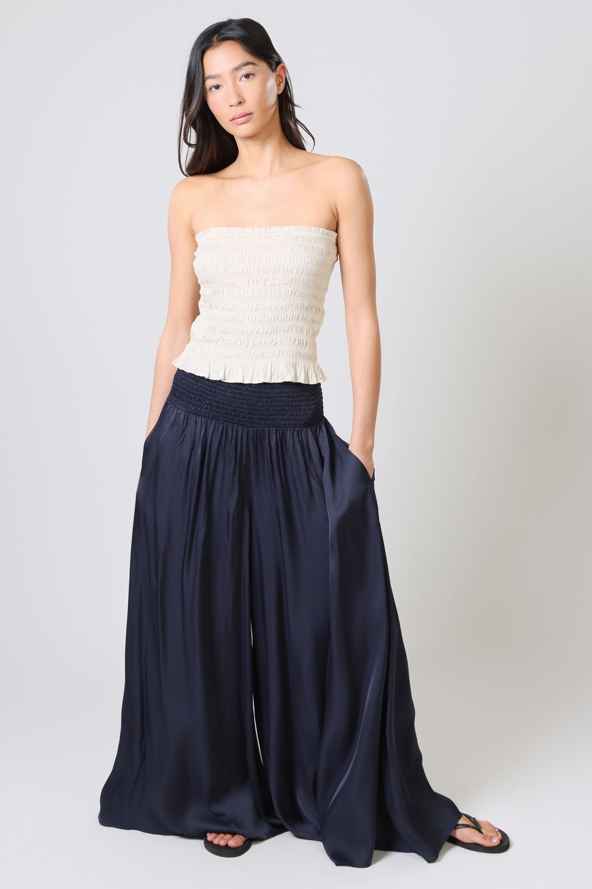 • Free billowing trousers with an ultra-wide elastic waistband designed to sit low or high on the hip. Side seam pockets.